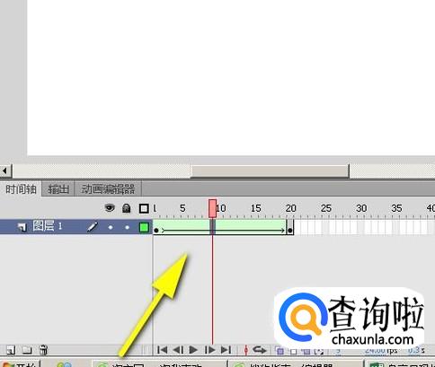这时,我们看时间轴这里,第1帧到第20帧之间呈绿色状态,而且中间有一条向右的箭头。这表示,创建形状补间动画成功啦。