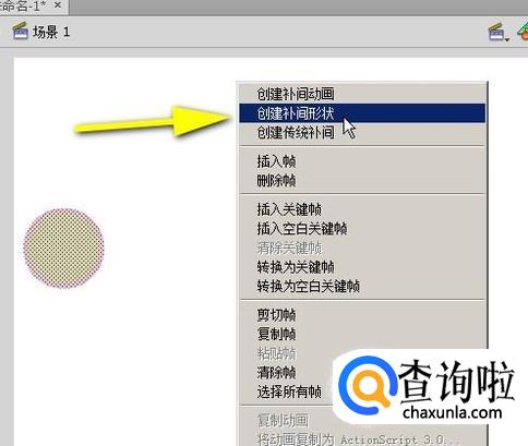 鼠标再移到时间轴这里,放在第1帧与第20帧之间的任意一帧上,再右击,弹出菜单,再点:创建补间形状