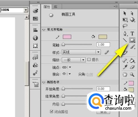 接着,进入到文档的操作个界面。再从右侧的工具栏中调出椭圆工具。再在属性面板中设置图形的填充色以及描边色。