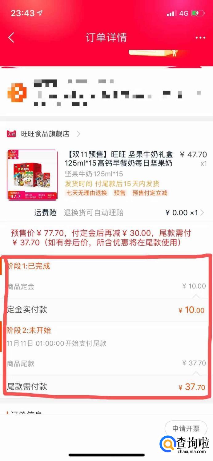 进入到订单详细页面,看清楚阶段一和阶段二的情况,注意一下自己的手机号和地址是否正确。