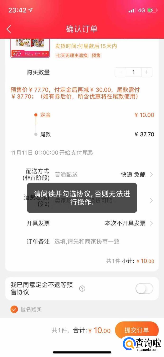 在你确认付款以前就会弹出一个让你勾选的协议,定金不退等预售协议需要好好阅读哦,完成阅读后就可以勾选了,然后确认付款。