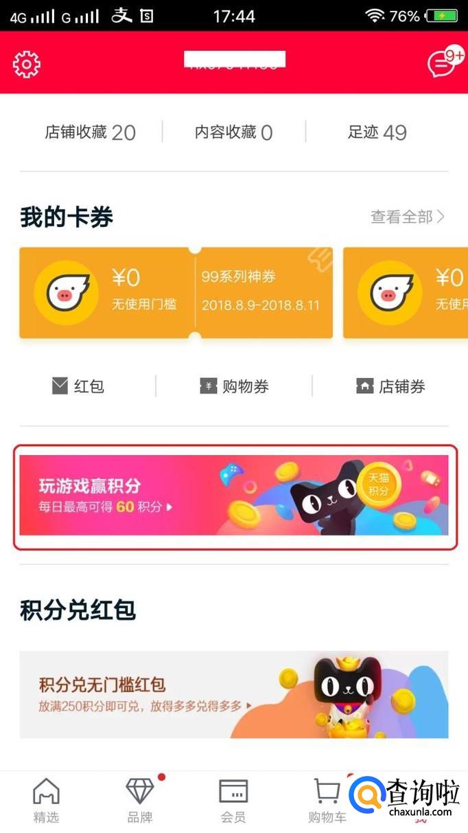登录之后进入个人页,往下划动页面,可以看到“玩游戏赢积分”活动,点击进入。