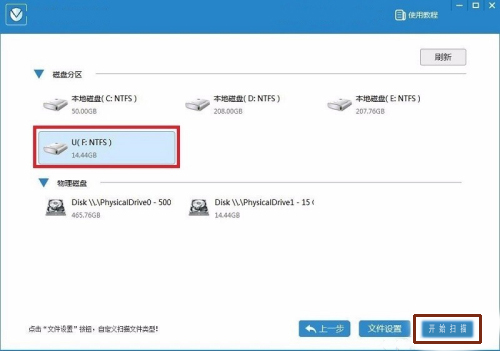 3、之后的软件界面上显示有读取到的U盘与电脑分区信息,在其中勾选中U盘分区后点击【开始扫描】按钮,软件就会开始对U盘进行数据的扫描工作了。