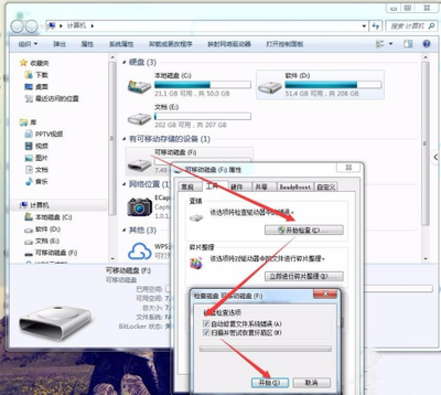 2、然后右击盘符,弹出的菜单里选择属性,然后打开对话框,选择工具选项卡,然后点击“开始检查”按钮,之后就弹出相关提示框,勾选好图中两个选项,点击【开始】即可进行u盘修复的工作了。