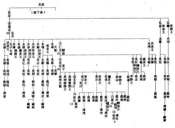 家族庞大,为了细分,乾隆开始定圣祖康熙帝开始以辈分排序的皇室子孙为近支宗室,而康熙之前的则为远支宗室无需以辈分命名。由嘉庆开始,又规定三代以内同辈同一世系第二个字的部首要相同。例如咸丰帝叫奕詝,有同父异母兄弟奕訢,两人名字的第二个字都是“言”部,但庆亲王奕劻的则是“力”部。