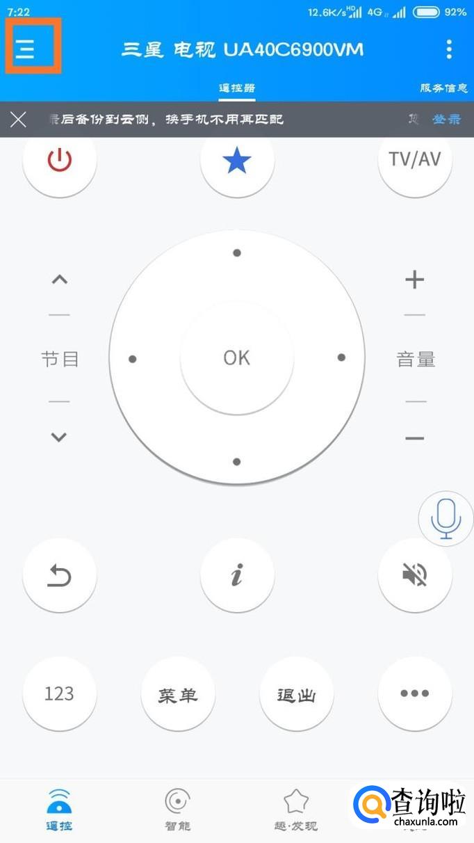 首先在应用市场下载一个“遥控精灵”安装好并打开,在首页中点击左上角的三根杠标志。