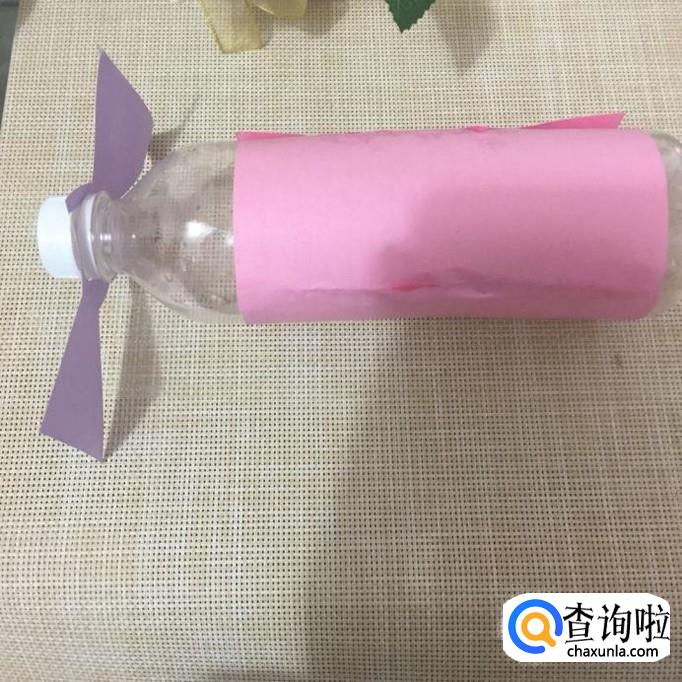 然后用剪刀剪出飞机模型的螺旋桨并安到矿泉水瓶的瓶口上,如下图所示。
