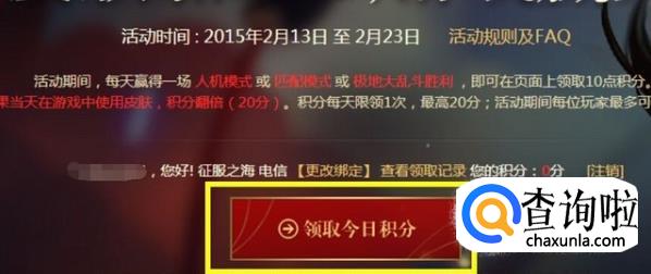 接着在打开的“玩游戏领头像”官方页面中,找到“领取今日积分”按钮,点击即可领取当日的积分。每位玩家每天只限领取1次,最高20分。
