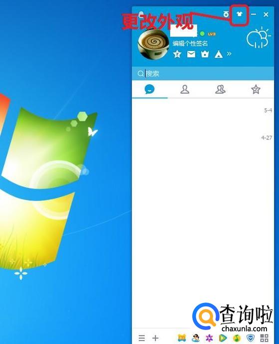 首先,我们打开电脑上的QQ软件,用账号密码登录,进入软件的主界面后,点击右上角“更改外观”按钮。