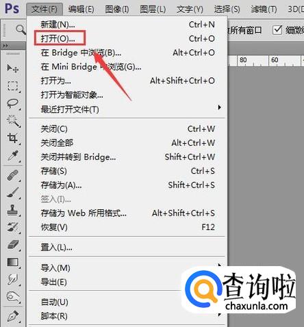 打开ps之后我们在菜单里找到文件选项,点击该选项在其子级菜单哪里找到打开选项,如图所示:
