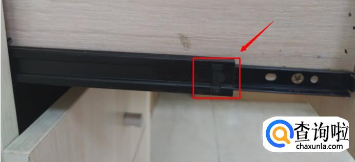 首先,把抽屉尽量往外拉,这时出现一个长条黑色锥形卡扣,如图所示。
