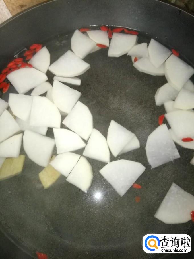 将白萝卜放入锅里,加入适量的水,煮开;再将枸杞和姜片放入锅里,煮一分钟;