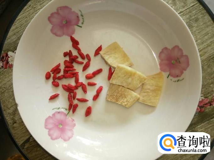 取一小块姜,将姜去皮,清洗干净,切成片状;取一小把枸杞,清洗干净,备用;