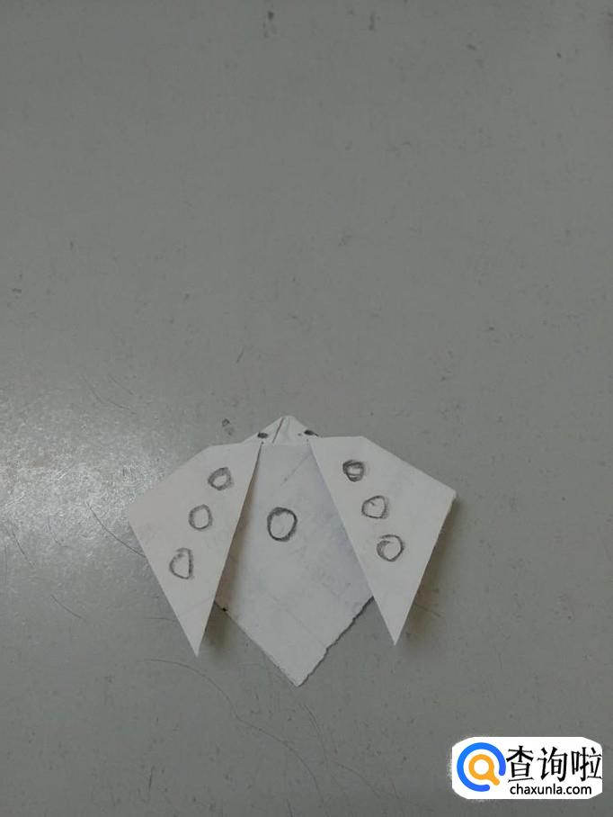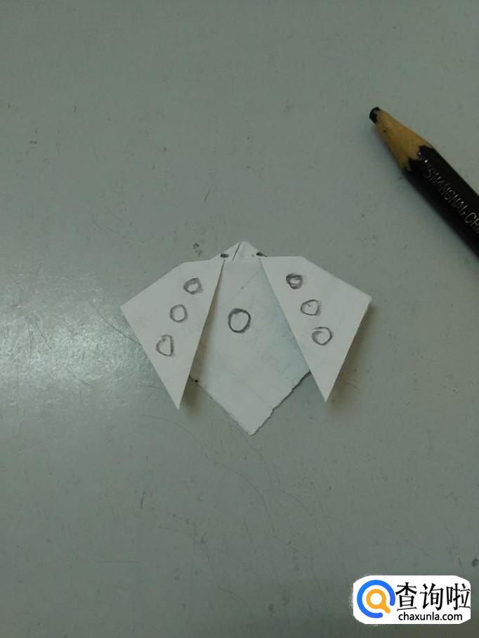 用笔在七星瓢虫头上点两个圆点,当做眼睛,在翅膀左右各画三个圆圈,表示六颗星,在两只翅膀中间画一个圆圈,表示第七颗星,七星瓢虫就折好了。