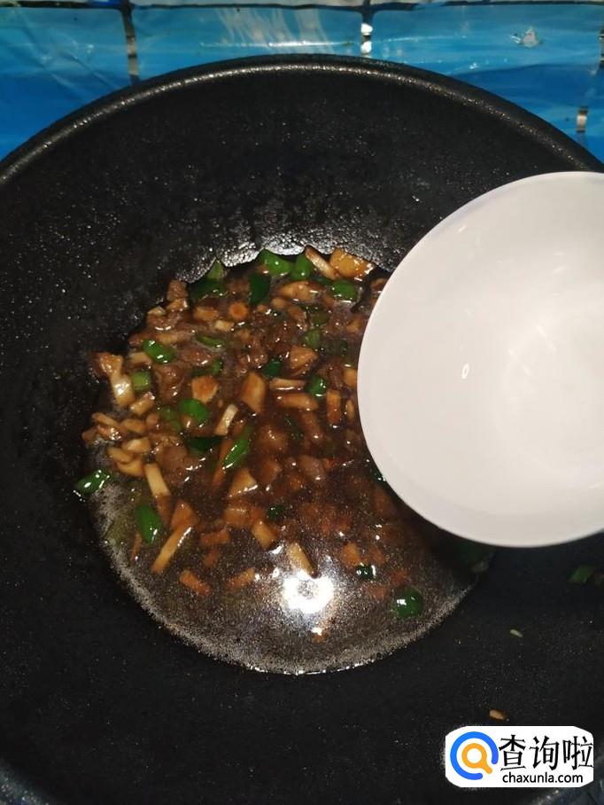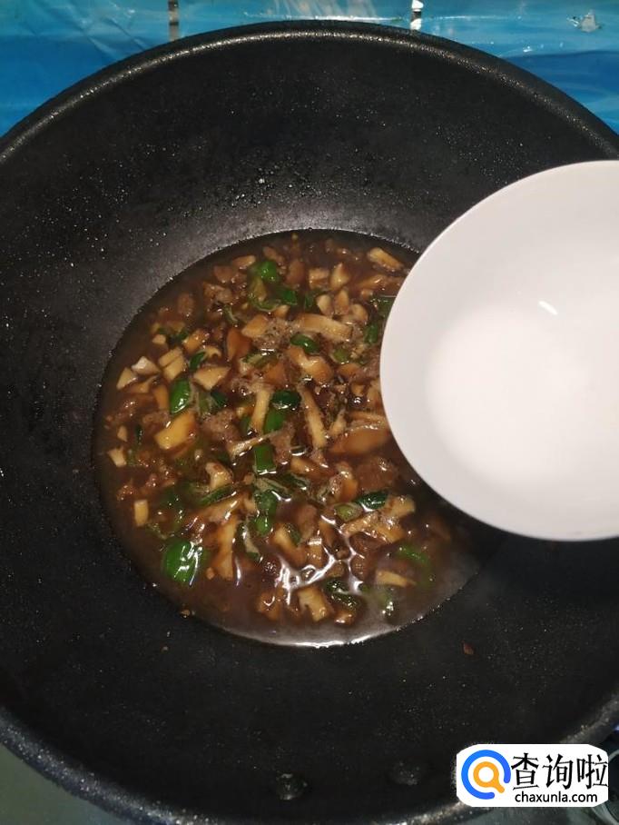 加入小半碗清水,大火将水烧开,煮三分钟左右,然后再用少许水淀粉勾芡一下,熬至汤汁浓稠,香菇牛肉酱就做好了。