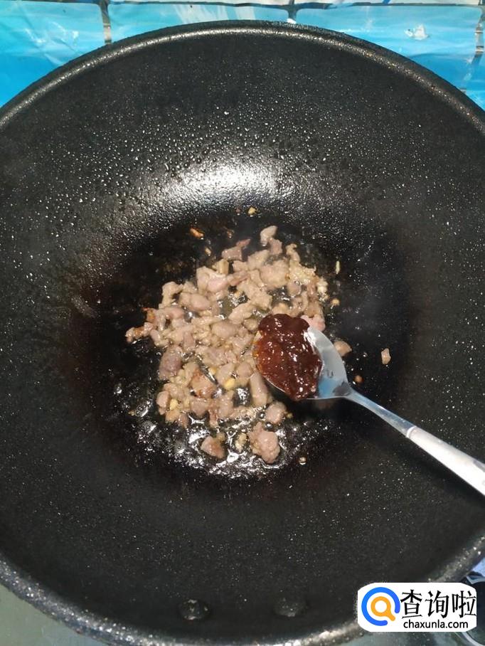 然后放一勺豆瓣酱,炸香,和牛肉放在一起搅拌一下。