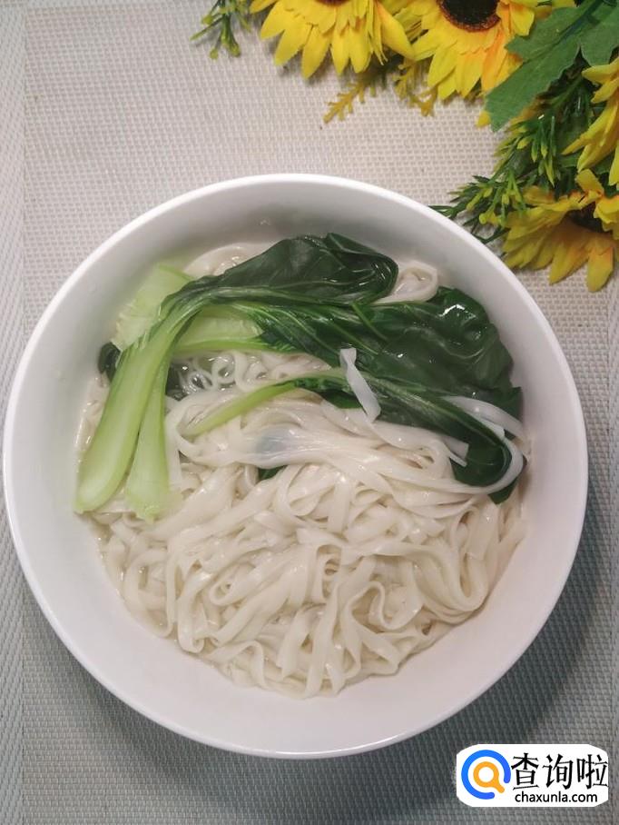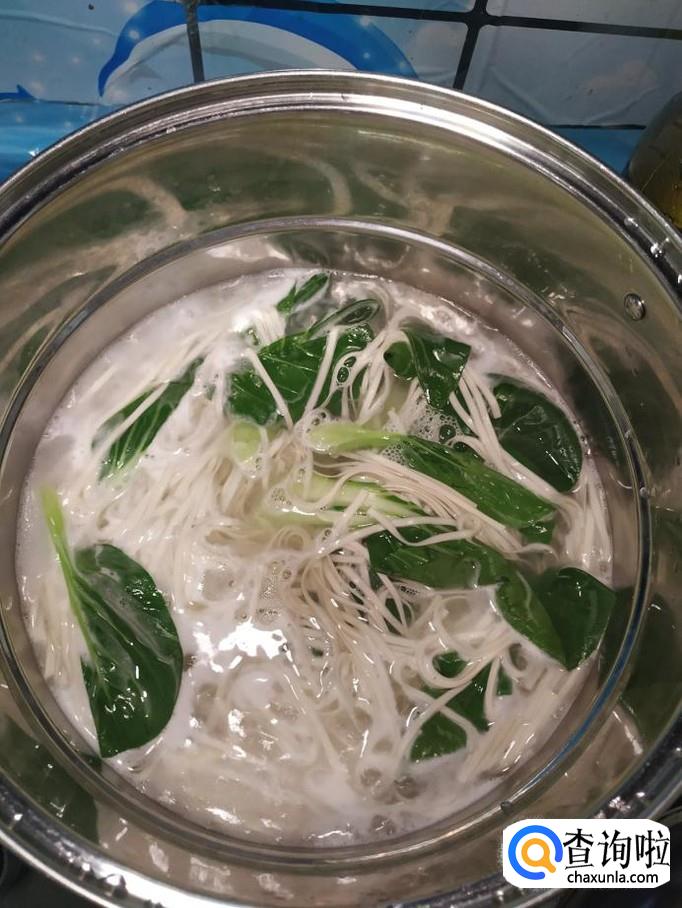 汤锅中放入适量清水,大火将水烧开,然后准备适量青菜洗净,和面条一起放入锅中,煮熟捞出,放入碗中备用。