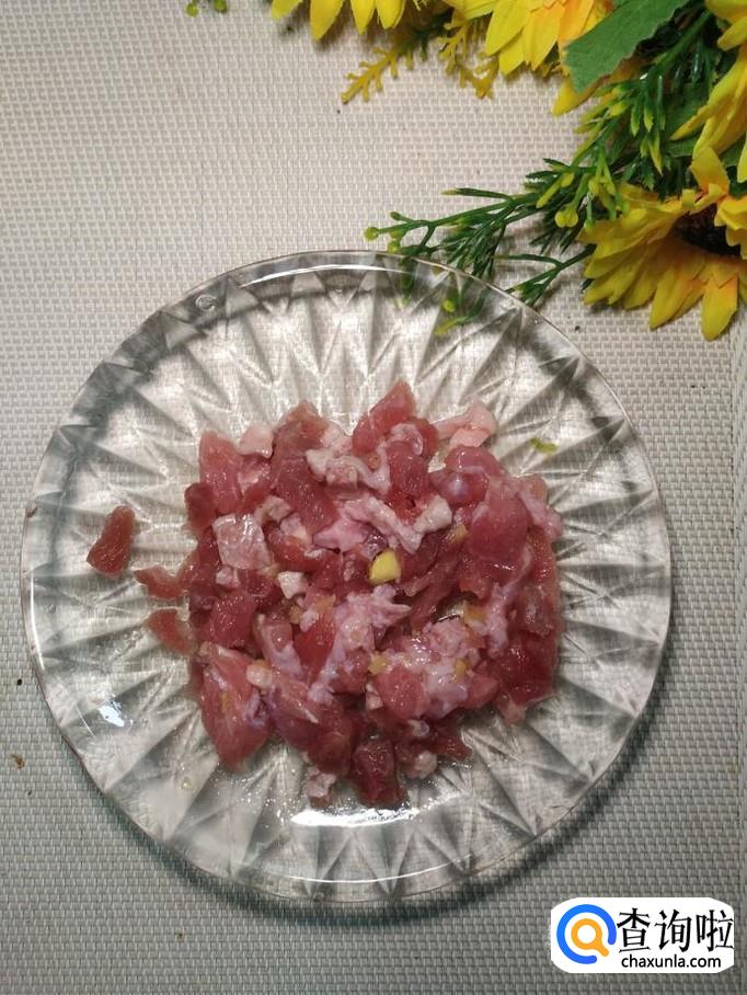 准备适量新鲜的牛肉,洗净后切碎放入盘中,再准备适量青椒切碎,放在上面,再加适量盐,鸡精,五香粉,料酒,搅拌均匀,腌制15分钟。