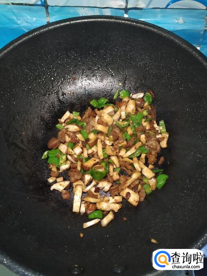 将准备好的香菇丁儿倒入锅中,和青椒一起翻炒均匀。