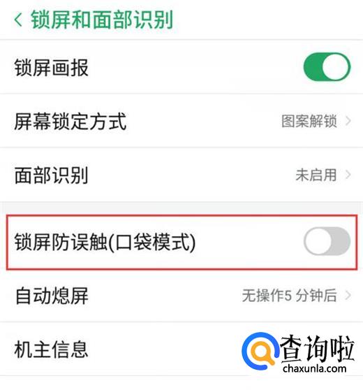 找到【锁屏防误触(口袋模式)】选项,点击开启右边的开关即可。