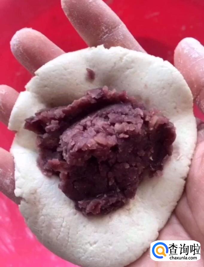 然后包上豆沙馅,就像包饺子一样,包好以后团成球状