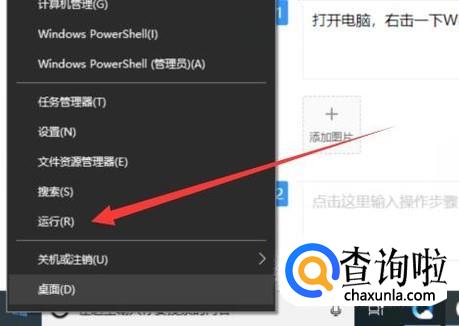 打开电脑,右击一下Windows按键,选择“运行”,如图所示。