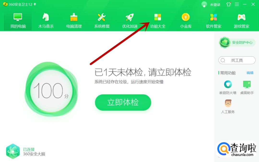 首先,打开360安全卫士,进入界面后,点击“功能大全”。
