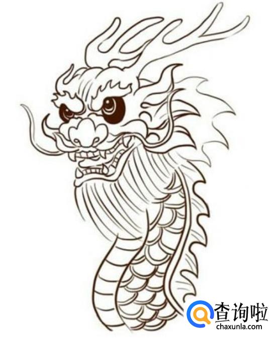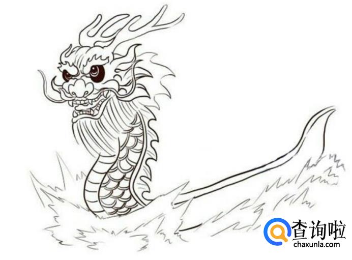 完善龙头部分后,用两条曲线画出龙的颈部位置。
