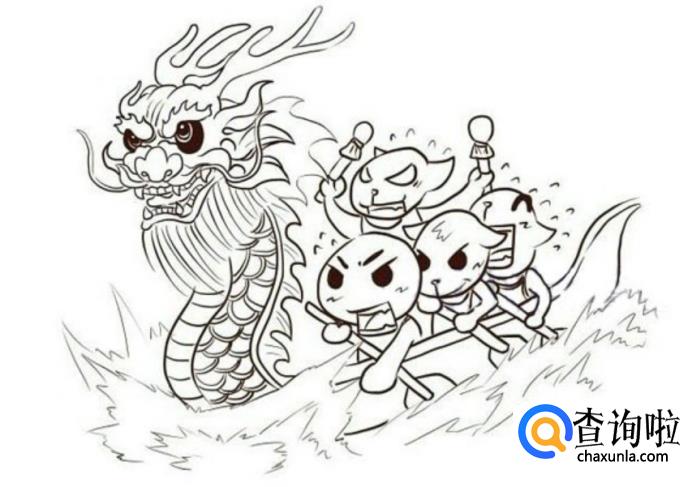 龙舟上画出几个划龙舟的人和打鼓的人。