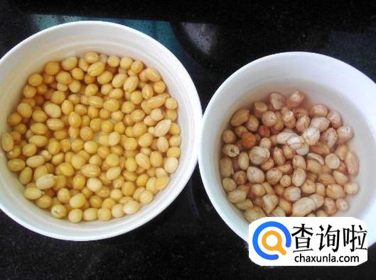 将黄豆和花生用清水泡发,最好泡半天,如图所示。
