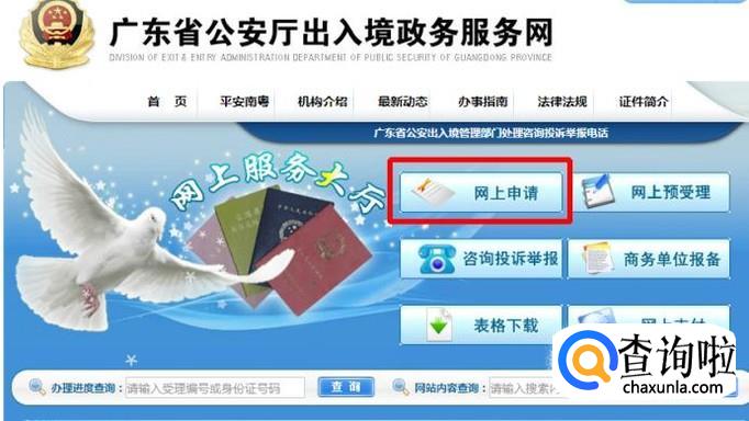 网上办理港澳通行证签注,首先要去各个省的公安厅出入境政务服务网(下面以广东省公安厅出入境政务服务网为例),找到网上申请,然后点击进入。