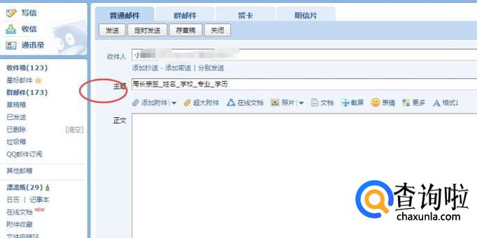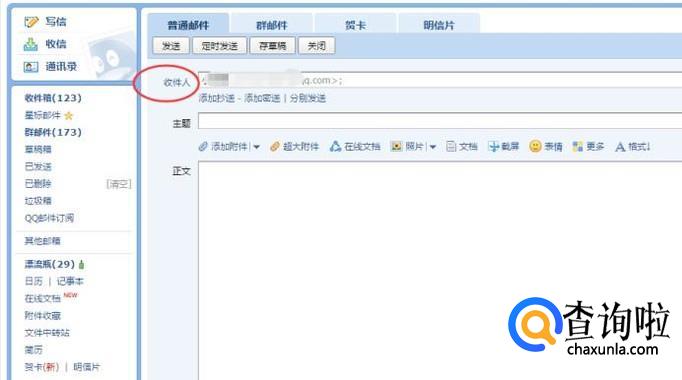 然后输入收件人,也就是对方的邮箱,如下图所示: