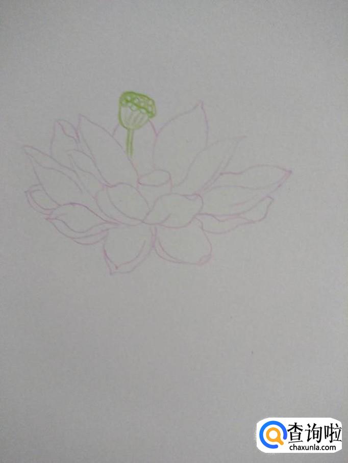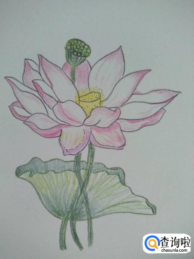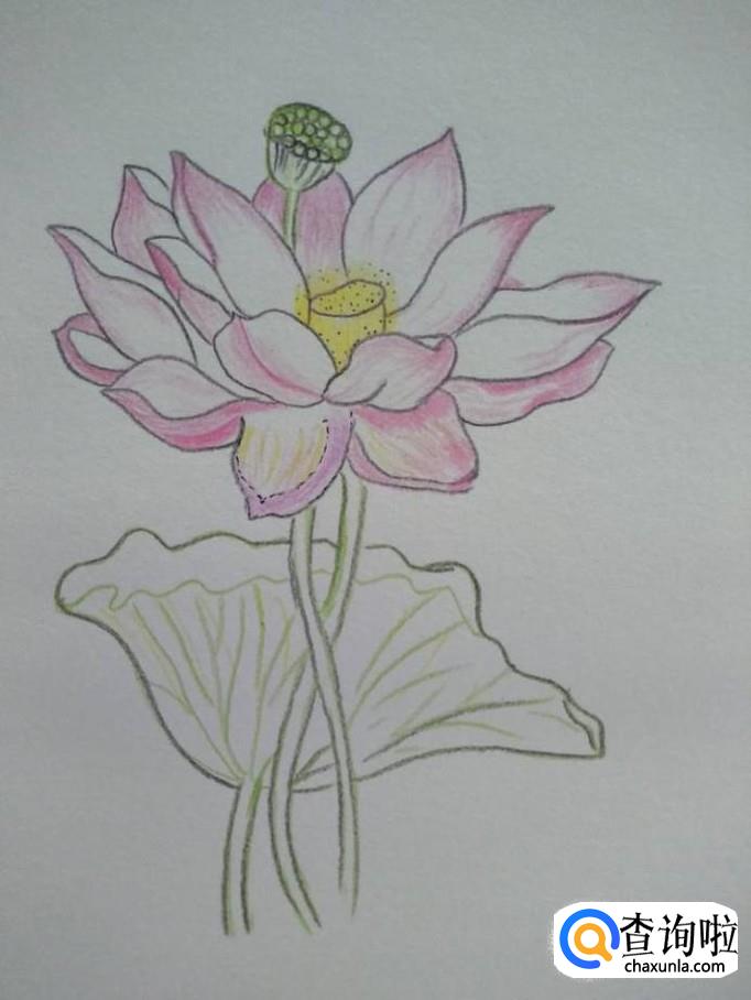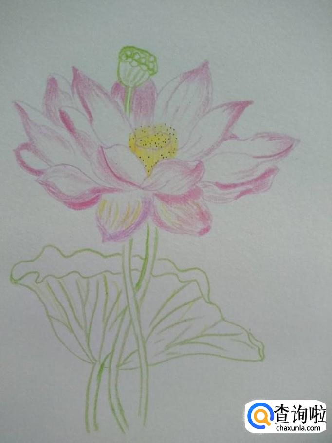 彩铅上色,荷花瓣的边缘用粉色彩铅上色,注意荷花瓣中部不要上粉色,可以用黄色彩铅在荷花中部润色。荷花中间的莲蓬用黄色彩铅上色,再用黑色的笔打上一些小点,使其更逼真。