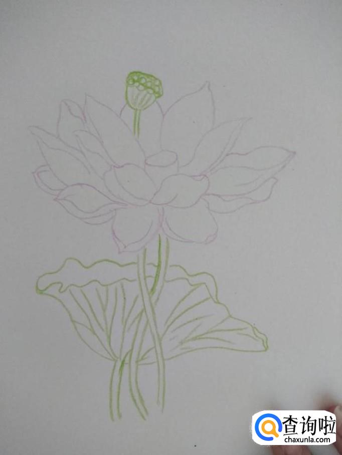 再把单独的莲蓬用深绿色的彩铅上色,荷叶的边缘也可以用深绿色勾勒。
