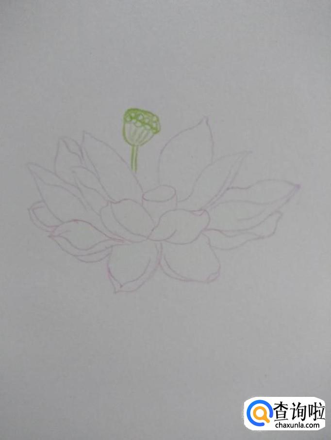 在预留的花瓣位置处画一个没有花瓣的莲蓬,画完之后,再补一瓣花瓣的位置,添上缺少的花瓣。