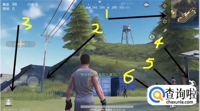进入游戏后会出现如图画面,图中的1,2,3,4,5,6分别代表打开地图,人物移动,,打开背包,人物跳跃,人物趴下和人物蹲下的操作,下图二为地图打开后效果