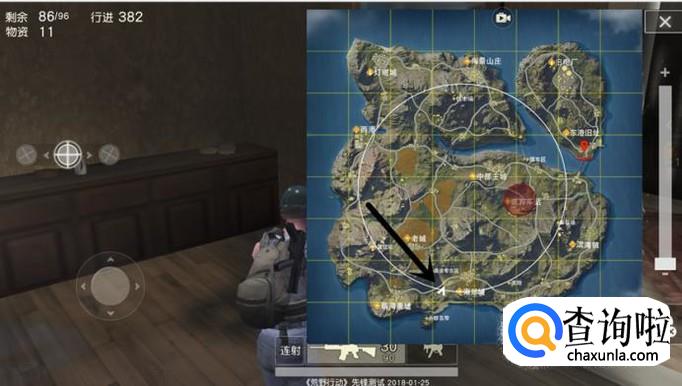 然后游戏的目的不断进入图中不断缩小的白色圆圈,并且杀光所有人。图中箭头所指位置即为你所指位置。
