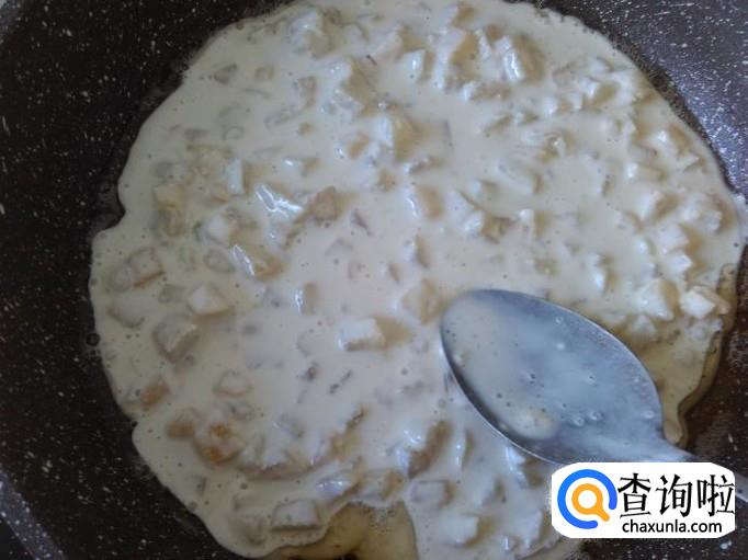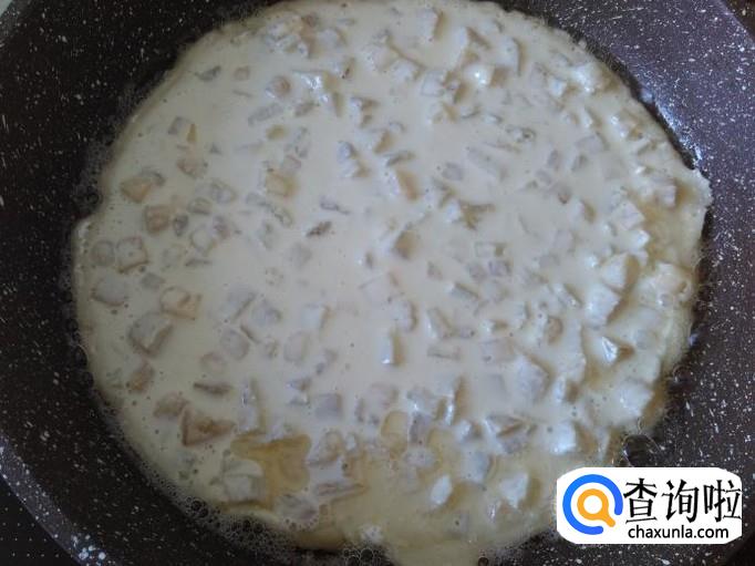 然后小火煎,一边煎一边轻轻摇动平底锅。
