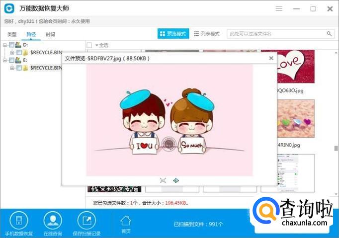 扫描结束后,在界面上选择要恢复的照片先预览,预览可以正常显示的大图就是可以正常恢复的,再把要恢复的照片全部选中,点击恢复按键即可。