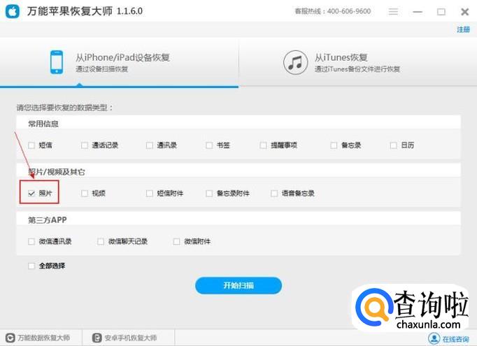 将手机连接到电脑上,然后运行软件,自动识别连接到手机上之后,在界面上会显示下图所示,勾选照片,然后点击开始扫描,进入扫描阶段,在扫描的时候不要中断扫描。