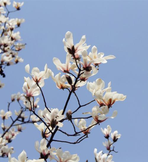 17、阳春下,微风里,白玉兰树斜斜的伸展着枝干,无叶无绿,只是朵朵优雅宁静的绽放。那白的有些温润的花瓣,隐隐的带着些香气,虽不浓郁却也清新自然。