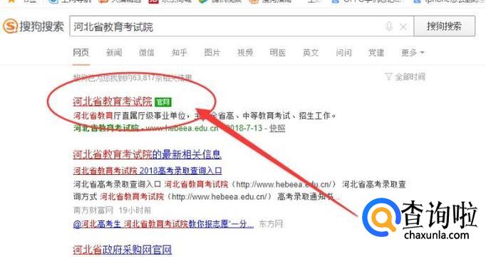 打开搜狗搜索,搜索“河北省教育考试院”,点击官网链接,如图所示。