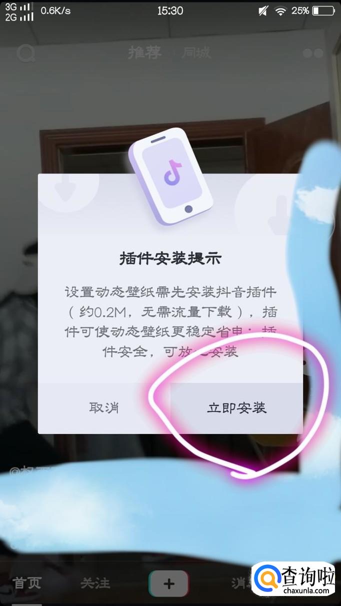 最后,我们点击“动态壁纸”后,需要安装一个“抖音插件”安装以后,我们再次找到自己想要设为动态壁纸的视频,再次点击“动态壁纸”后,点击“应用”,即可