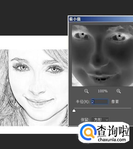 接着,再在菜单栏顺序点:滤镜--其它--最小值,调出其操作面板。把半径设置为1或是2;再点确定。