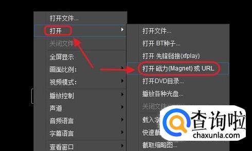 当然如果我们有磁力链接的话,在影音先锋播放器的播放窗口点击鼠标右键,依次点击“打开”-“打开磁力链接或URL”,将磁力链接粘贴进去也可以,如图所示...