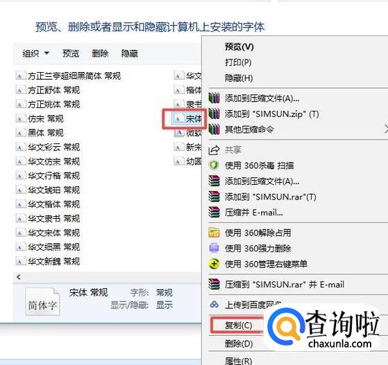 弹出的界面,我们找到宋体,然后我们右击选择复制;
