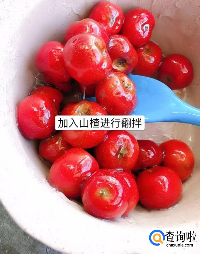 接着把山楂加入不停的翻拌,如下图所示。