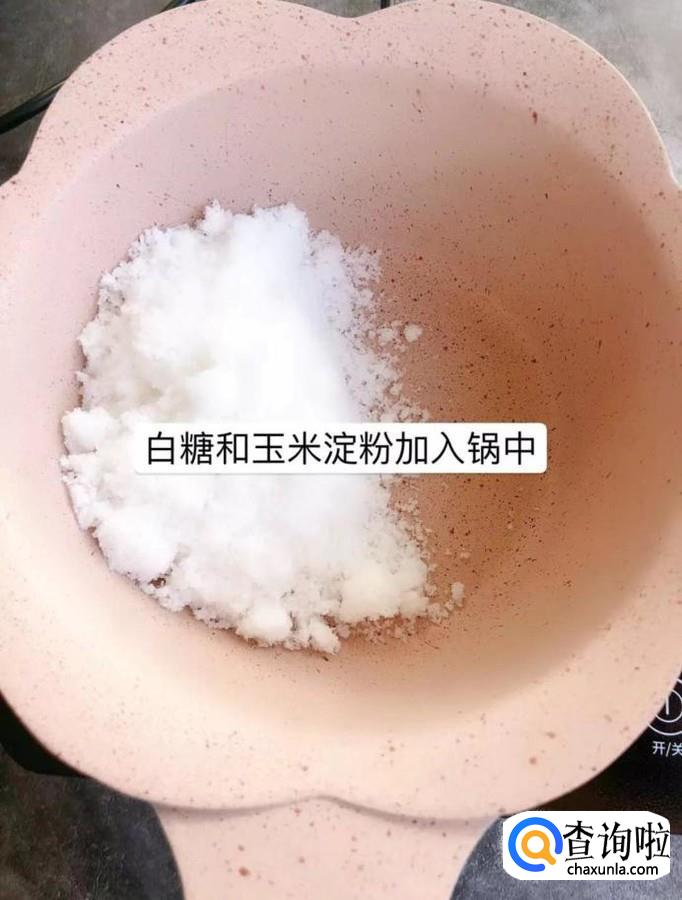 首先把白糖和玉米淀粉加入锅中,如下图所示。