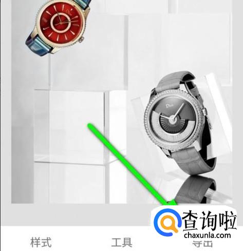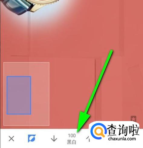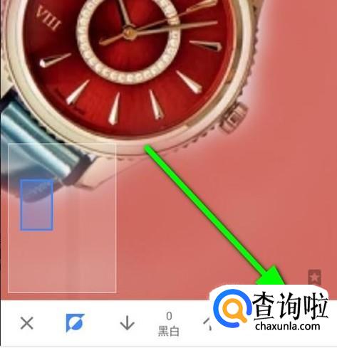 接下来,我们把照片左侧的手表这里放大图像,手指再在手表上涂抹,可以看到手表在一片红色中露出来了。但,手表四周有些地方是涂抹多了,那么,我们再在界面底部这里把“黑白”的数值设置为100;再在手表四周涂抹,把刚才涂抹多的给擦回去。