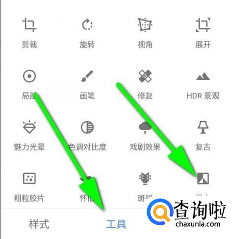 照片导入到软件界面后,在界面的底部这里手指轻点一下“工具”选项,打开工具面板。在工具面板中有多款工具和滤镜,从中找到“黑白”效果,如下图箭头所指。